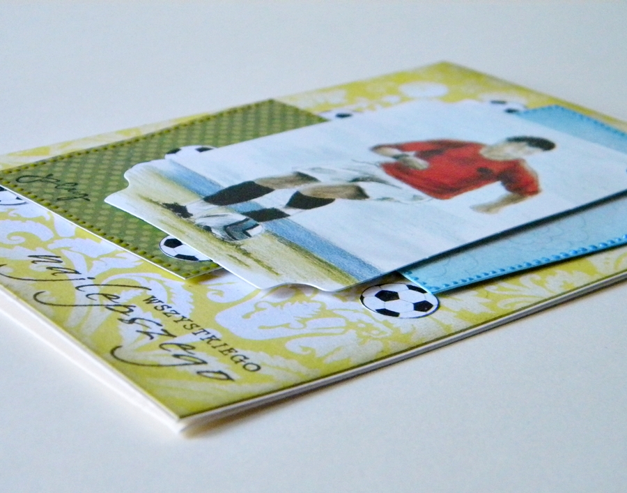 Dziś kolejna kartka z serii raczej męskich. Tym razem o tematyce piłki nożnej. Stemple - napis i wycięte piłki skomponowane na górze i rogach pochodzą ze scrap.com.pl